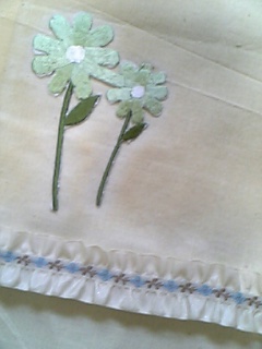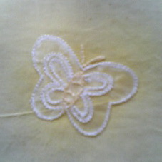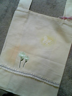 チロリアンテープを縫い付け、お花と蝶のワッペンをくっつけた。
